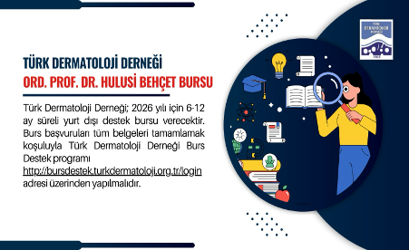 Türk Dermatoloji Derneği, 2026 yılı için 6-12 ay süreli yurt dışı destek bursu verecektir. Burs başvuruları tüm belgeleri tamamlamak koşuluyla Türk Dermatoloji Derneği Burs Destek programı http://bursdestek.turkdermatoloji.org.tr/login adresi üzerinden yapılmalıdır.
