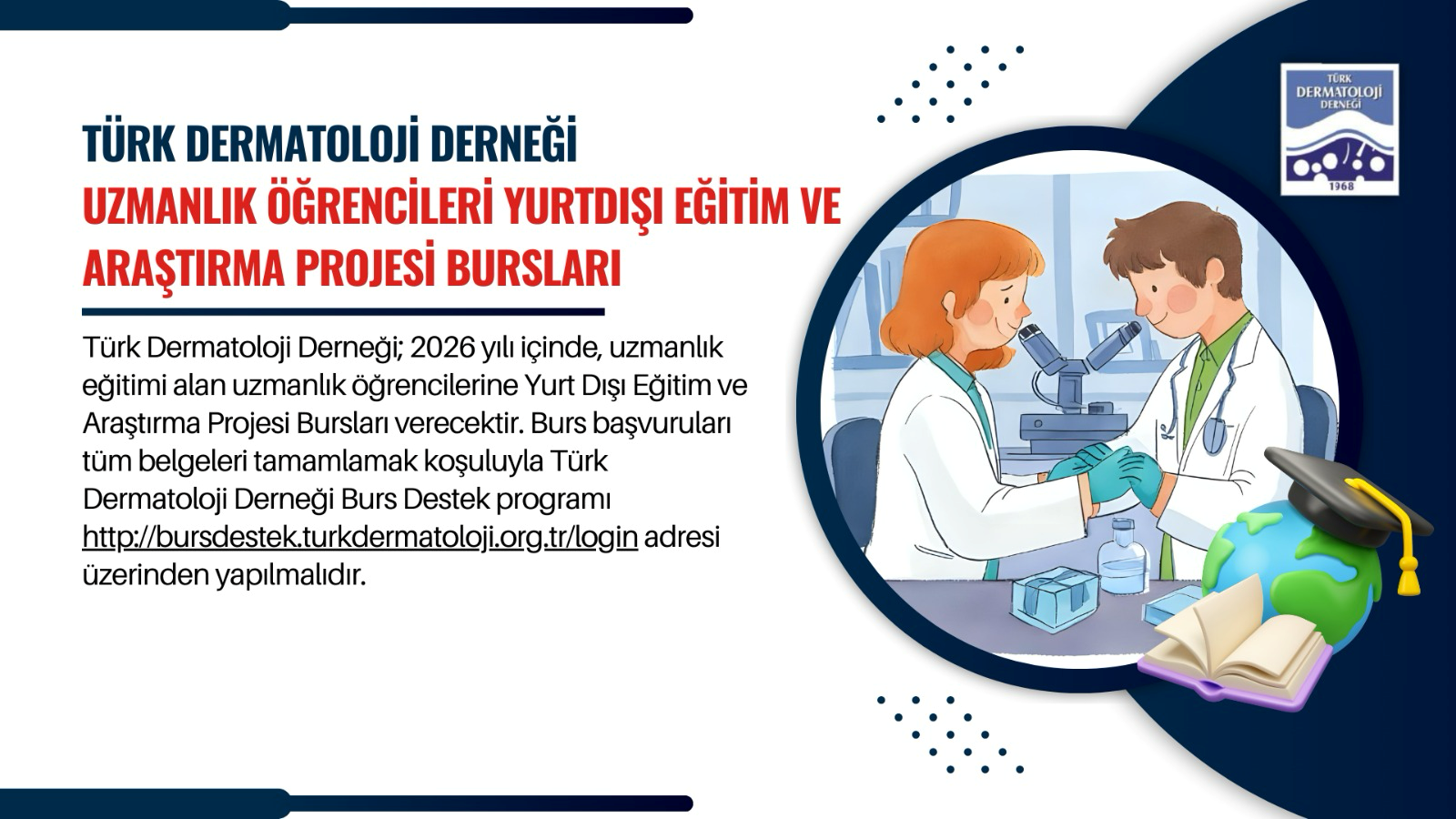 Türk Dermatoloji Derneği; 2026 yılı içinde, uzmanlık eğitimi alan uzmanlık öğrencilerine Yurt Dışı Eğitim ve Araştırma Projesi Bursları verecektir. Burs başvuruları tüm belgeleri tamamlamak koşuluyla Türk Dermatoloji Derneği Burs Destek programı http://bursdestek.turkdermatoloji.org.tr/login adresi üzerinden yapılmalıdır.